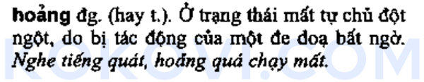 사전에 등재된 hoảng의 의미는 갑작스런 위협으로 인해 순간적으로 자제력을 잃은 상태 로 풀이할 수 있으며, 이해를 돕기 위해 "고함 소리에 너무 호앙 하여 도망쳤다"는 예문을 덧붙이기도 했습니다.